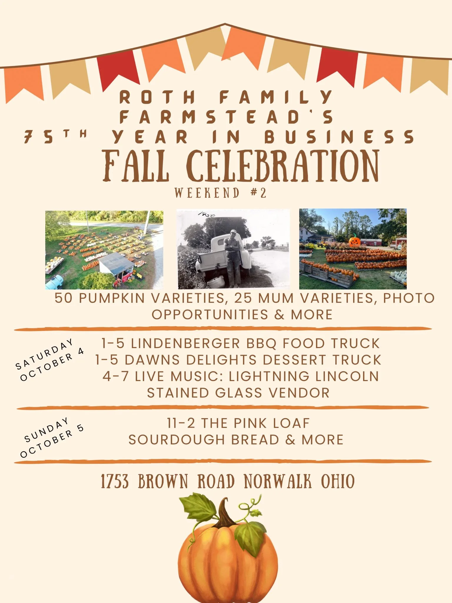 Our family is excited to celebrate our 75th anniversary with you! For three generations, Roth Family Farmstead has been “getting our hands dirty, putting food in yours” right here on the west side of Norwalk. Since 1950, we’ve been proud to share high-quality freezer beef, sweet corn, mums, pumpkins, strawberries, and even wedding décor options with our community. Now, we invite you to join us for two weekends of Fall Celebrations as we honor our roots and the traditions that make this farm special.